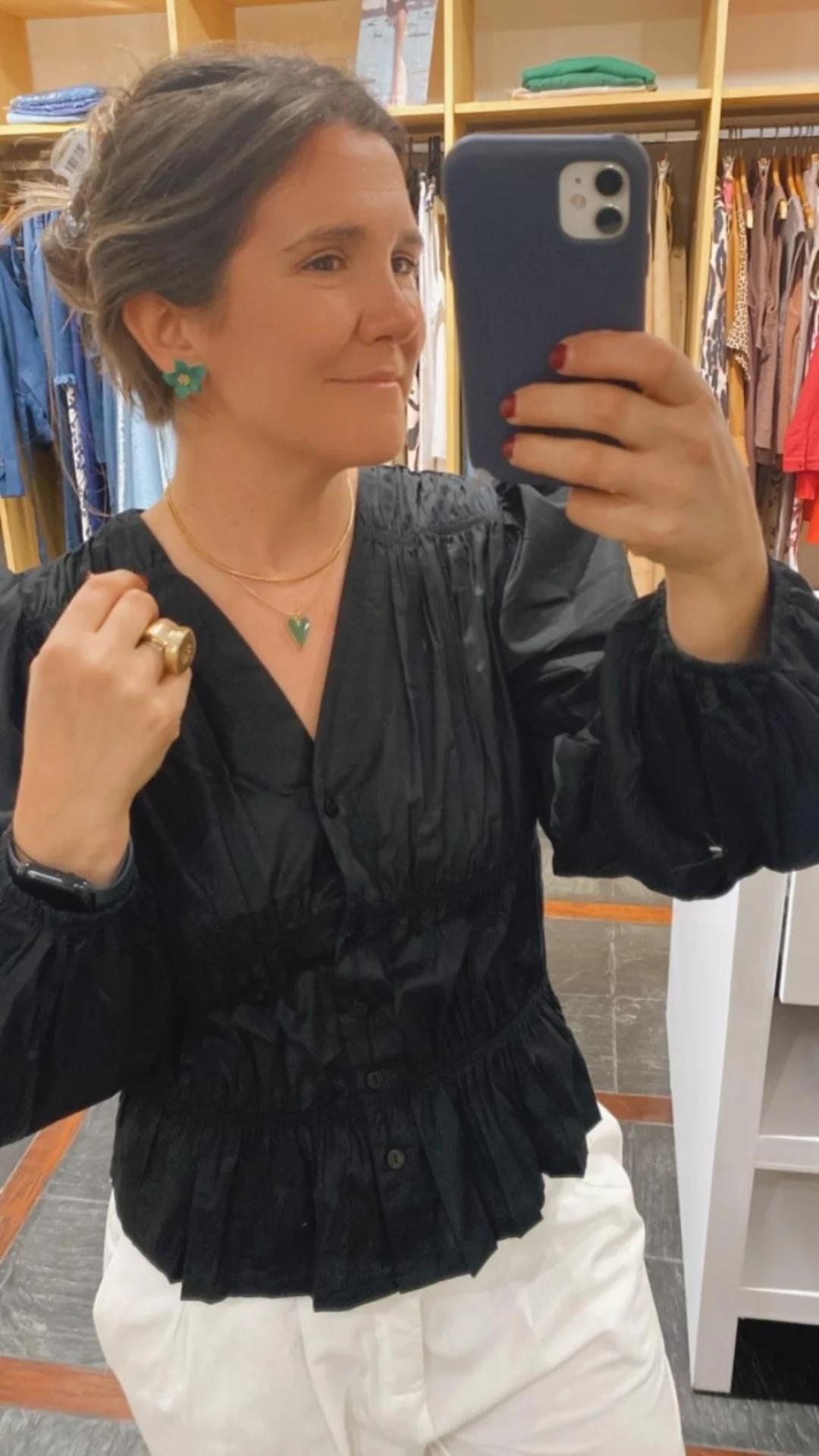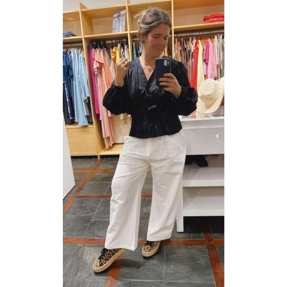 La blusa Cardumen,realizada en tela Poplin de algodón, muestra un corte suelto con frunces y abotonada en el frente.Su estilo romantico y con sus mangas globo resulta ideal para vestir comoda y chic.
