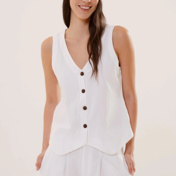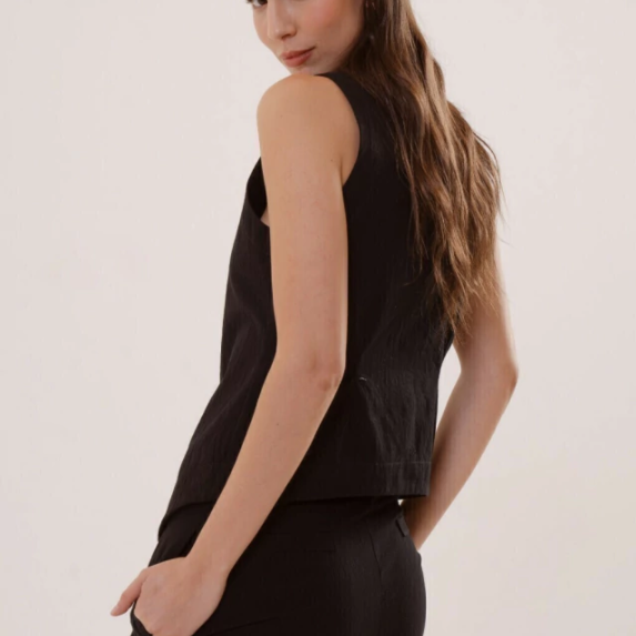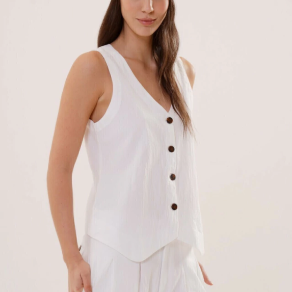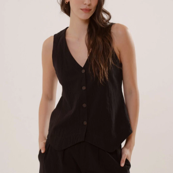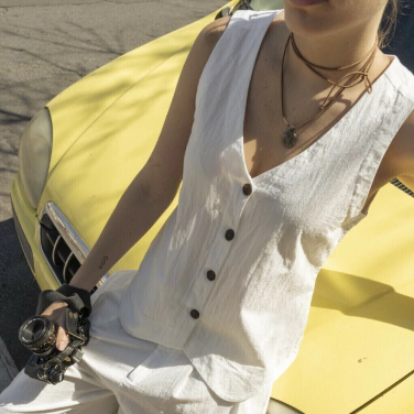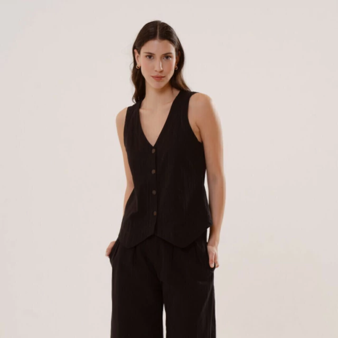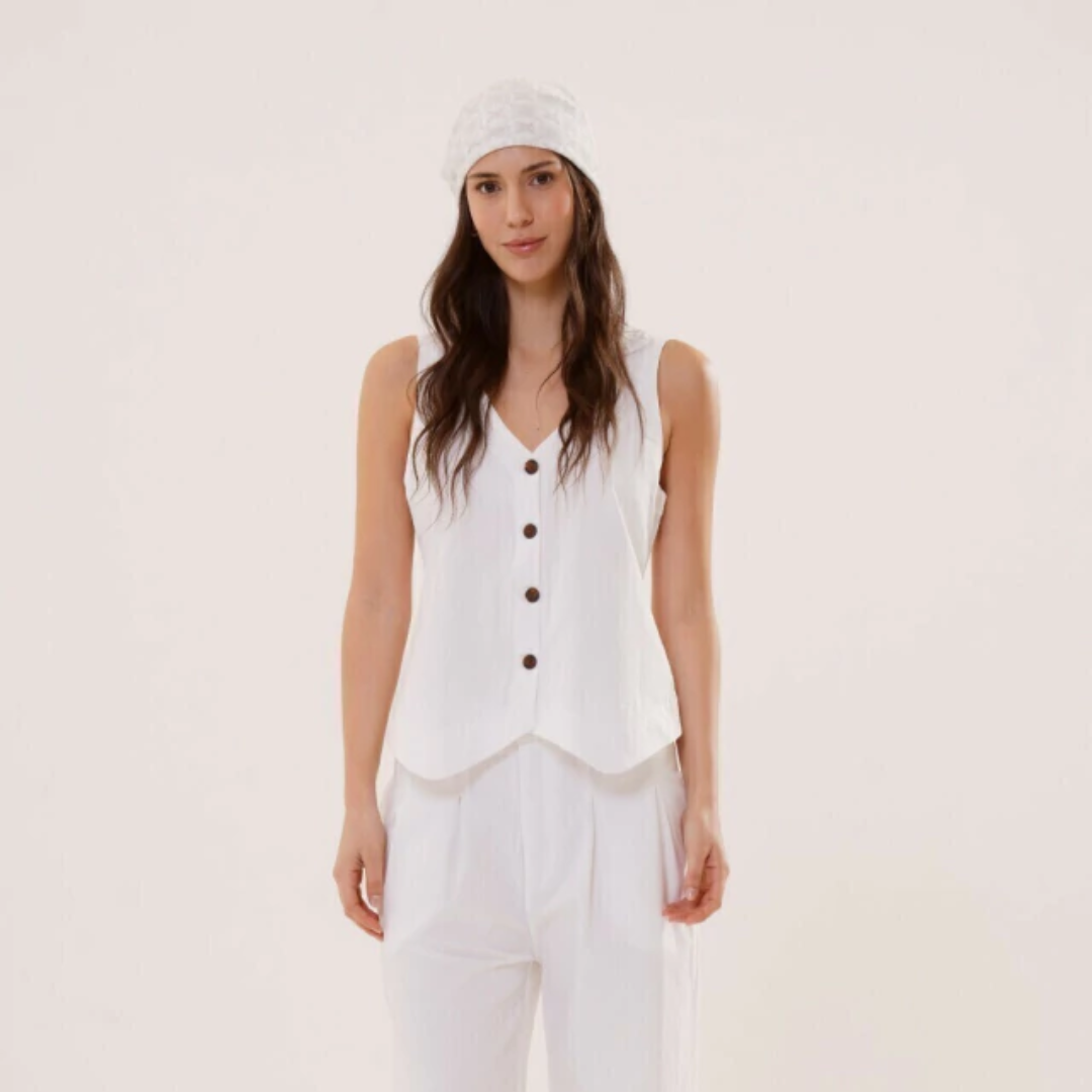 El chaleco Ravello es único: de silueta relajada y estética formal, con distintos largos según frente y espalda. Está confeccionado en tela 100% algodón, con cuerpo y asegura respirabilidad.
