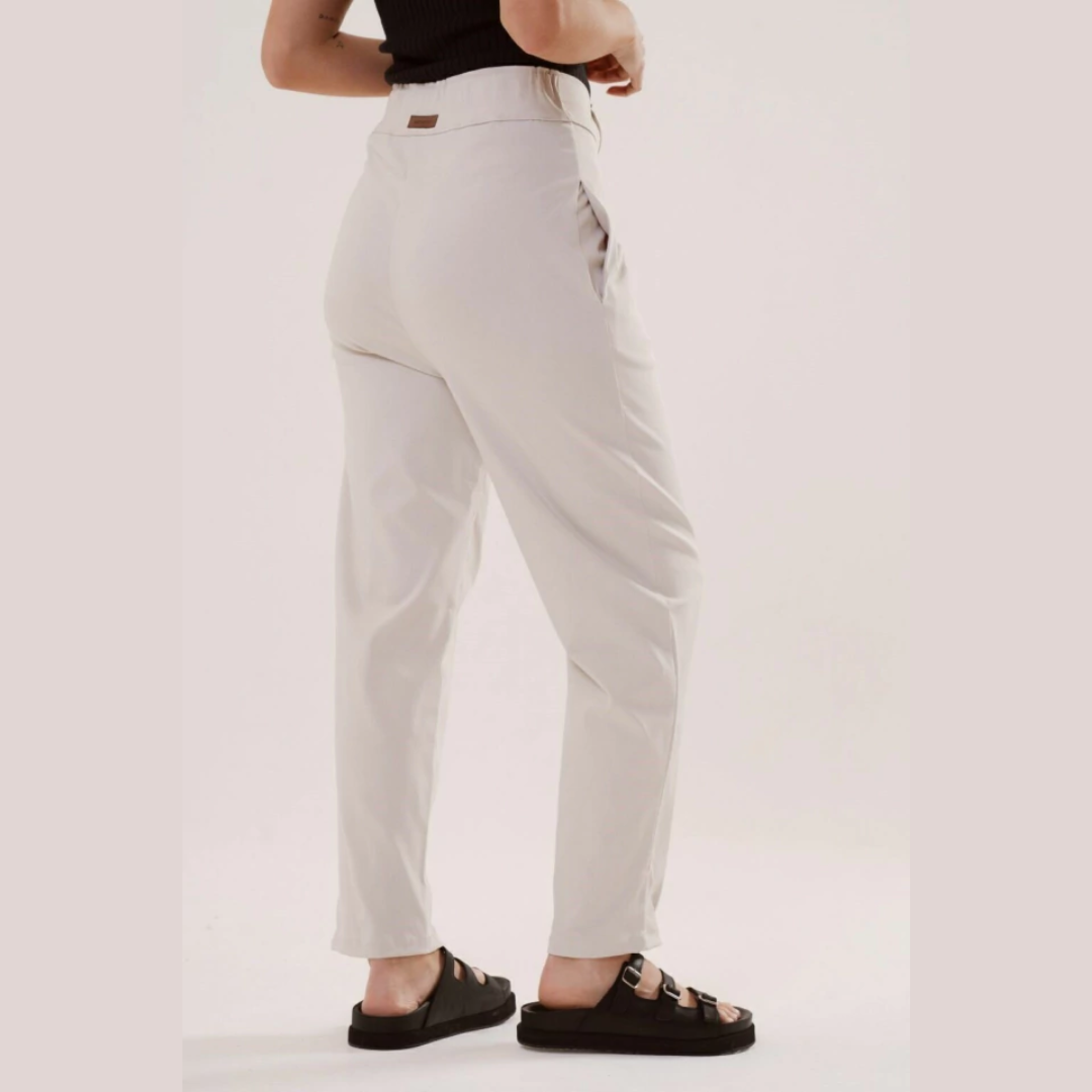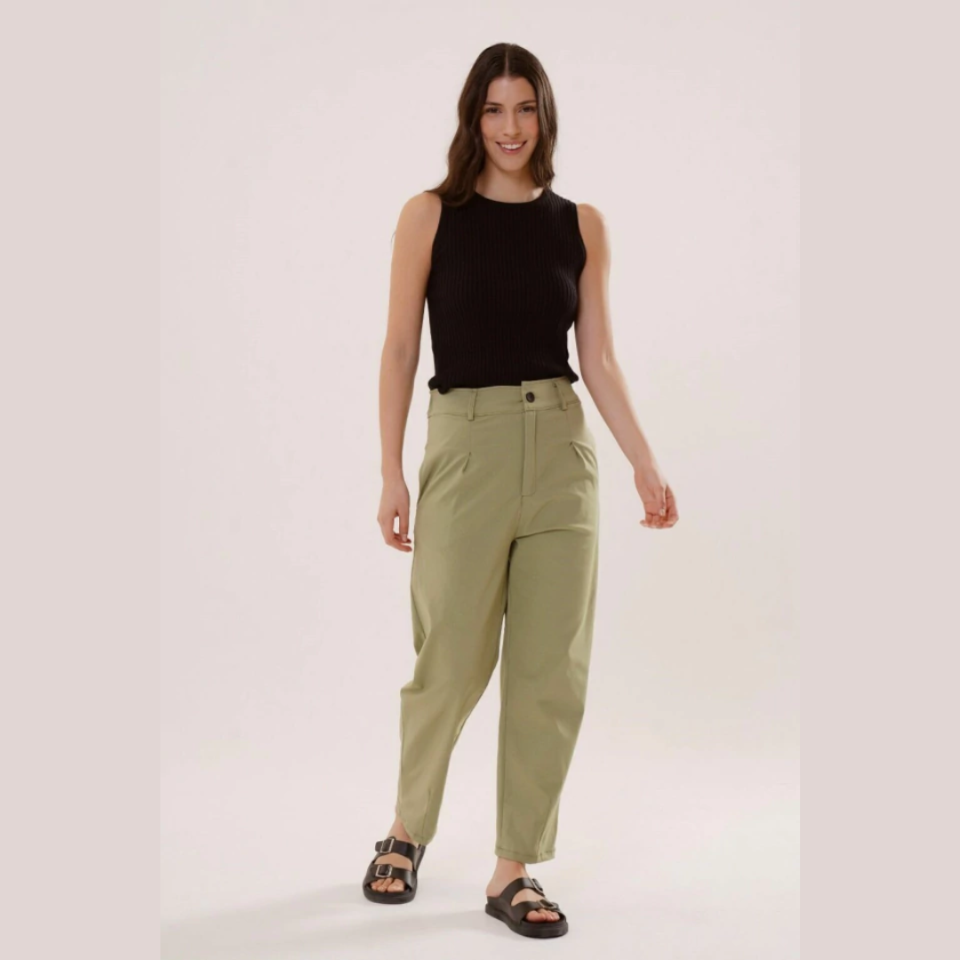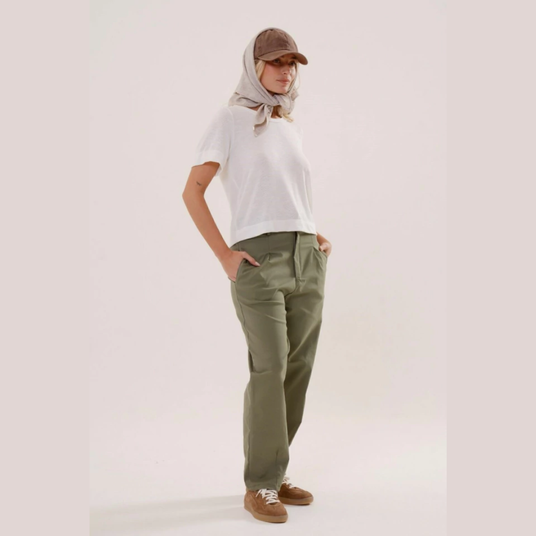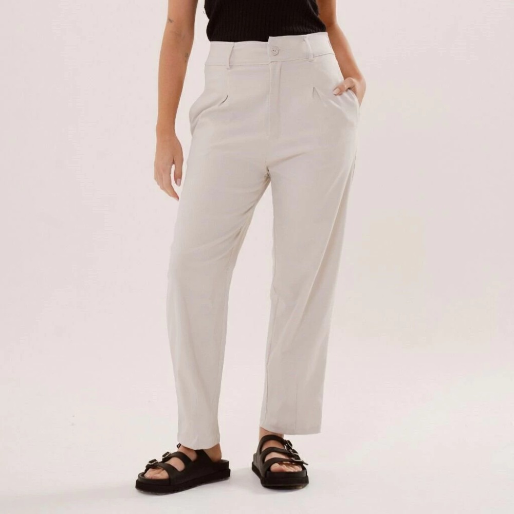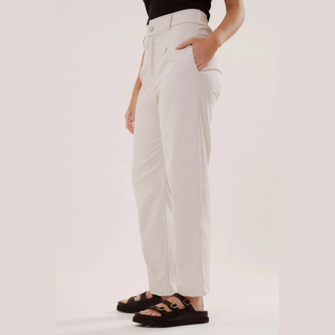 El pantalon Marinella de tiro medio,silueta recta con pinzas en el frente y bolsillos laterales, con elástico en cintura trasera,esta confeccionado en tela Bengalina, confortable y que se adapta al cuerpo.