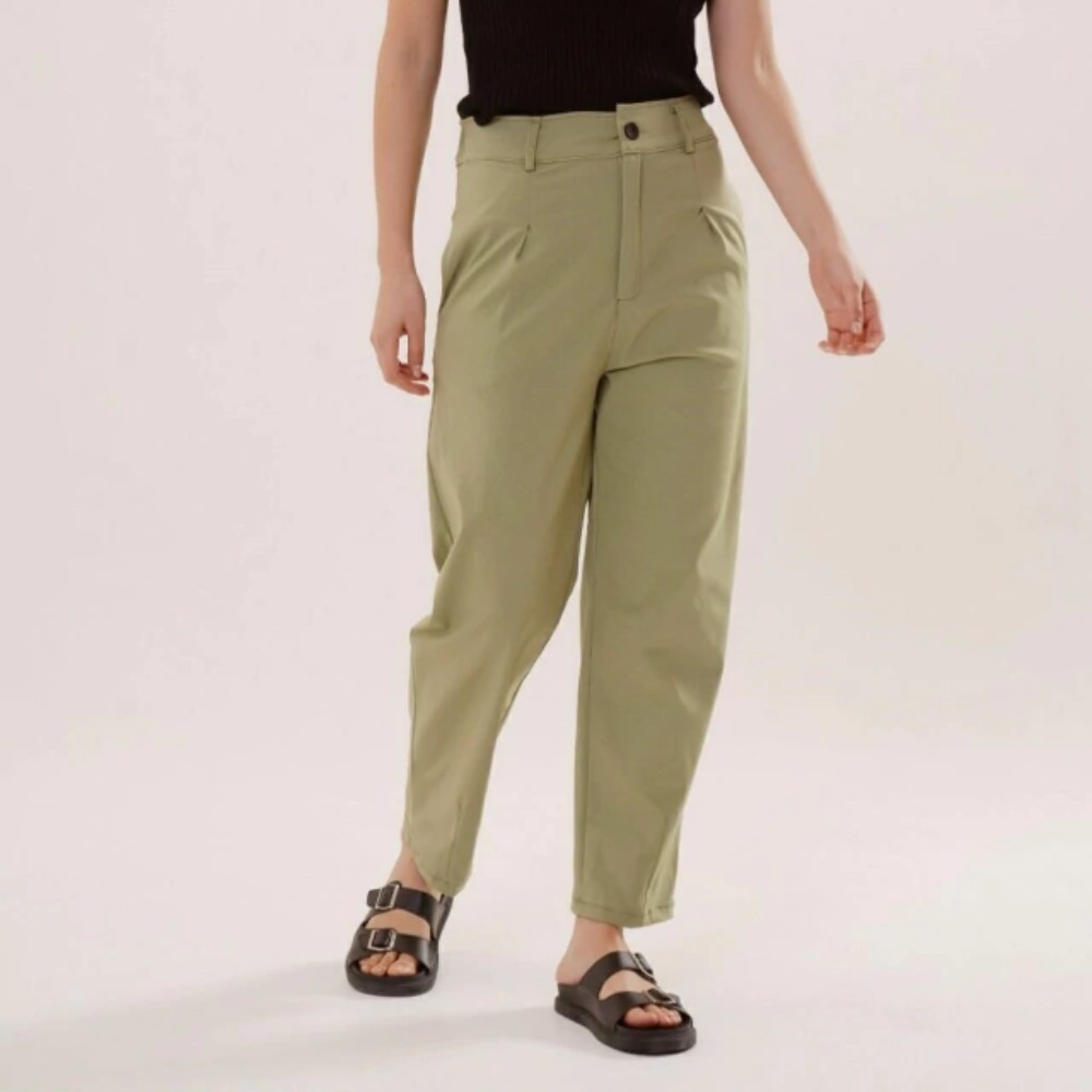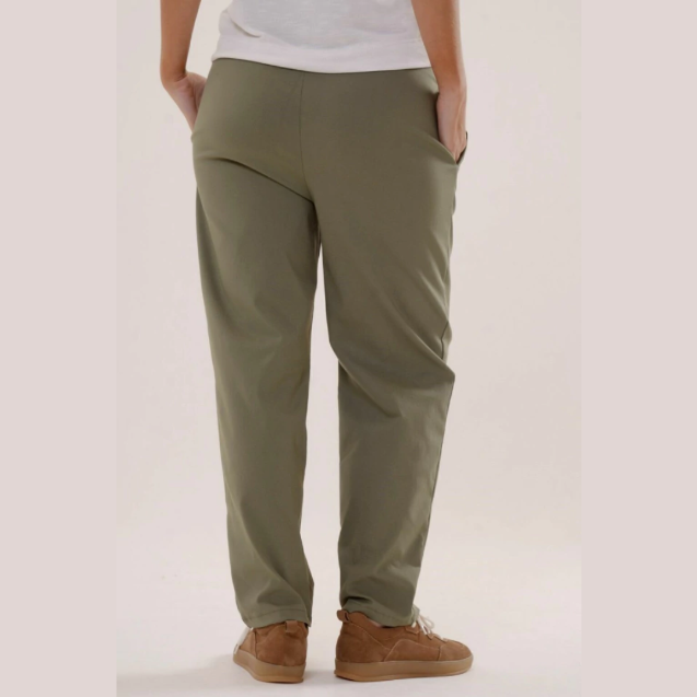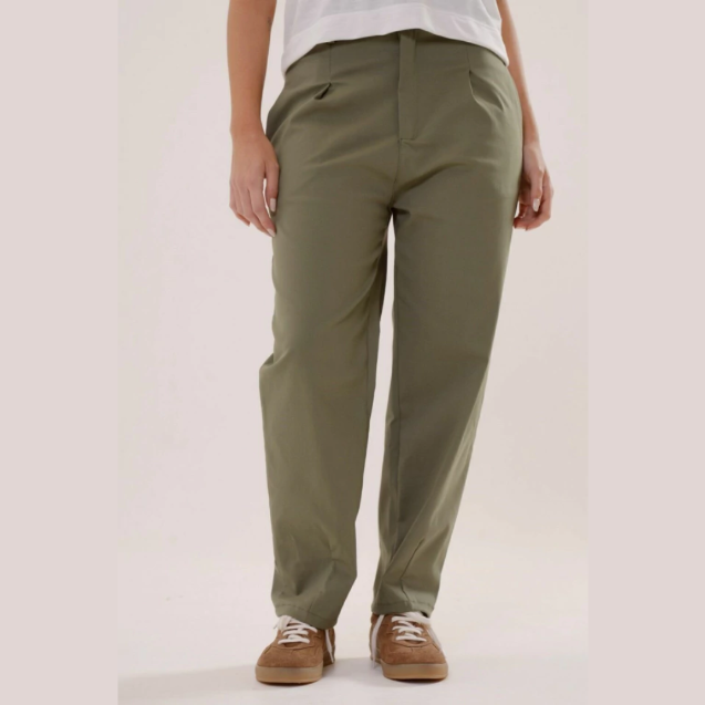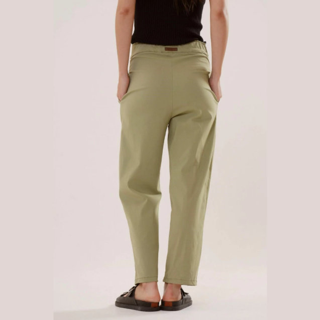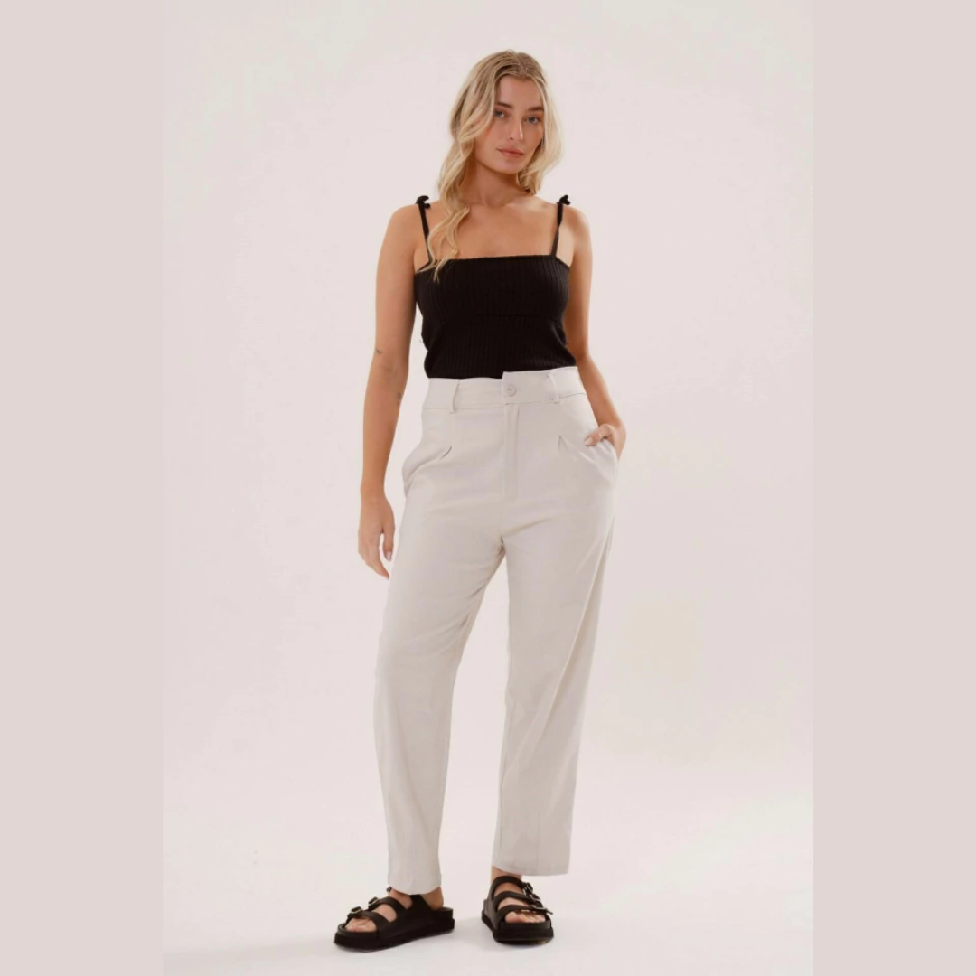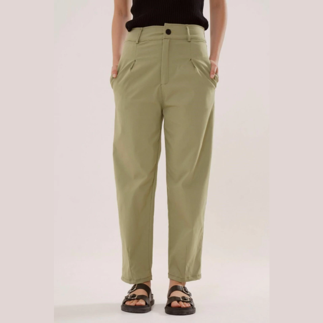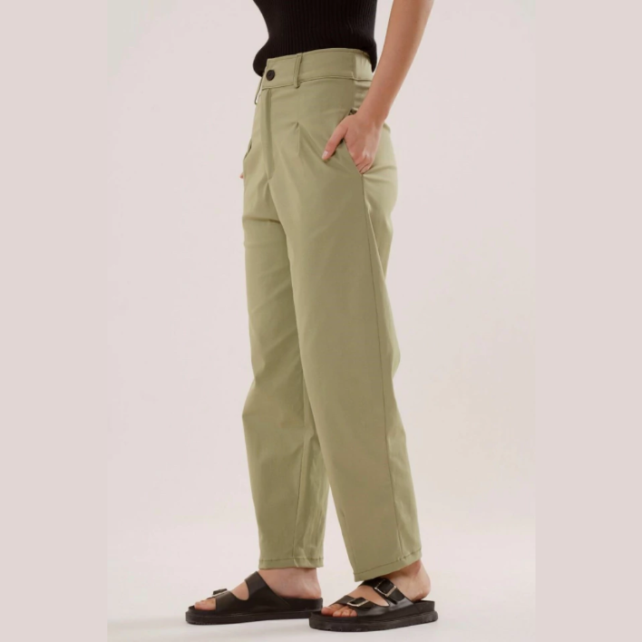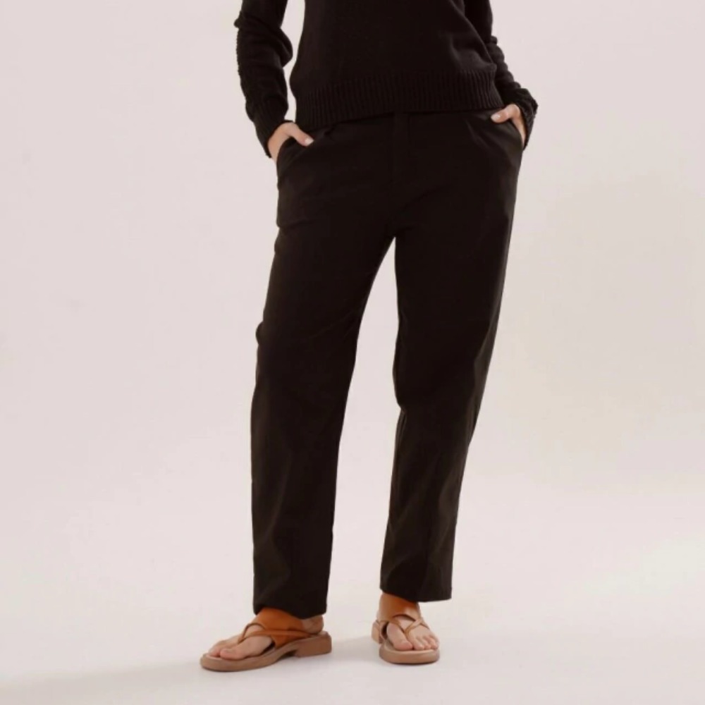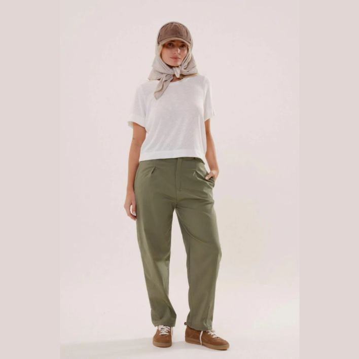 El pantalon Marinella de tiro medio,silueta recta con pinzas en el frente y bolsillos laterales, con elástico en cintura trasera,esta confeccionado en tela Bengalina, confortable y que se adapta al cuerpo.